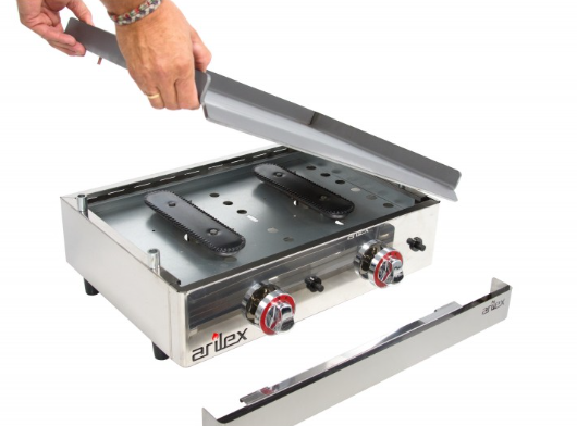 Queimador de design ARILEX com saída de chama em todo o seu perímetro garantindo uma distribuição uniforme de calor por toda a placa. Sem “zonas frias”. Alta potência de aquecimento com termopar de segurança.