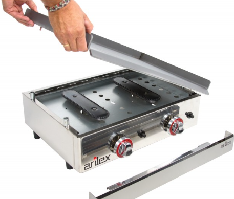 Queimador de design ARILEX com saída de chama em todo o seu perímetro garantindo uma distribuição uniforme de calor por toda a placa. Sem “zonas frias”. Alta potência de aquecimento com termopar de segurança.