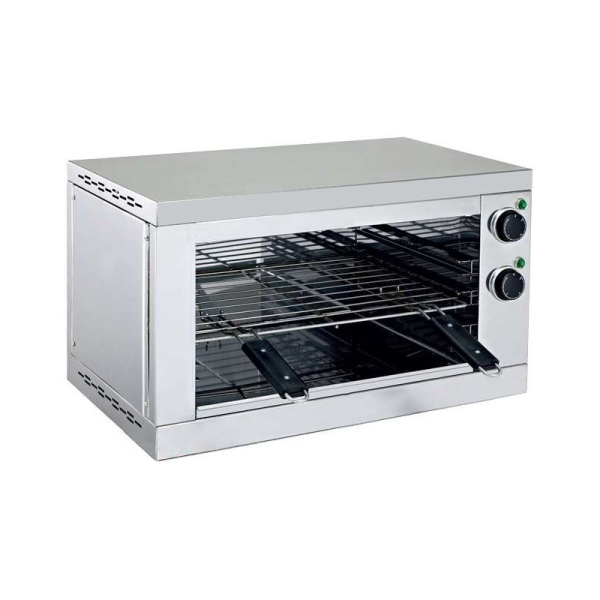 Características técnicas – Ideal para grelhar diretamente ou gratinar todo o tipo de alimentos antes de os servir. – Fabricado em aço inoxidável. – Elemento de aquecimento blindado em aço inoxidável. – Indicador luminoso de funcionamento. – Grelhador amovível e regulável com 2 níveis de cozedura. – Gaveta de recolha de migalhas. – Regulador de potência.