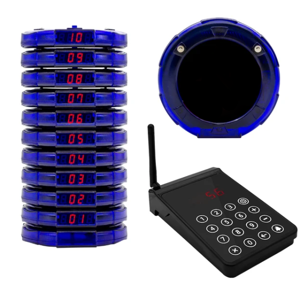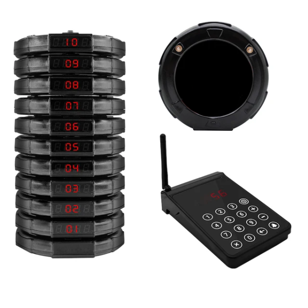 Características técnicas: O sistema de chamada sem fio consiste em 10 discos e 1 teclado transmissor. Adota tecnologia sem fio RF com milhões de códigos de aprendizagem diferentes. Quando o cliente faz um pedido, recebe um disco com um número, quando o pedido estiver pronto, o colaborador pressionará o número do teclado para ligar para o disco, então o cliente receberá as informações pelas indicações de buzzer/vibração/LED.
