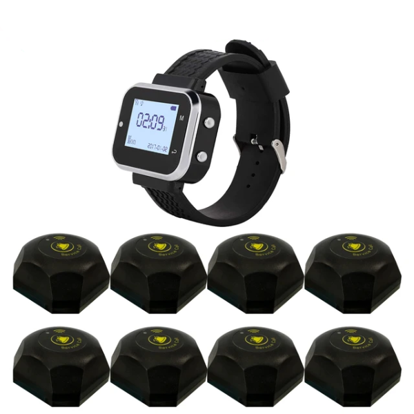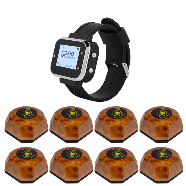 Características técnicas: Grande capacidade: o relógio pode se conectar com 500 pcs de transmissores de botão de chamada, dígitos: 0-9, letra: A-Z, dígitos de exibição: 2,3,4. Tais como: A5, B65, R555, E45, 33, 90. COZINHA, BAR1, BAR2, BAR3, BAR4, Y789. ….. Receptor do relógio do idioma múltiplo. Russo, inglês, ucraniano, espanhol, alemão, francês, italiano. 3 alertas MODOS: Vibração, sinal sonoro, flash claro; você pode ajustar livremente. Built-in 33 tipos de funções de chamada, que podem ser definidas livremente. Cancelar, chamada, conta, ordem, bebida, narguilé, SOS, água, médico, enfermeira, SOS, cozinha, Bar, etc Mais tempo standby. 7 dias tempo de espera na condição de ideia, menor consumo de energia, bateria de lítio recarregável embutida.