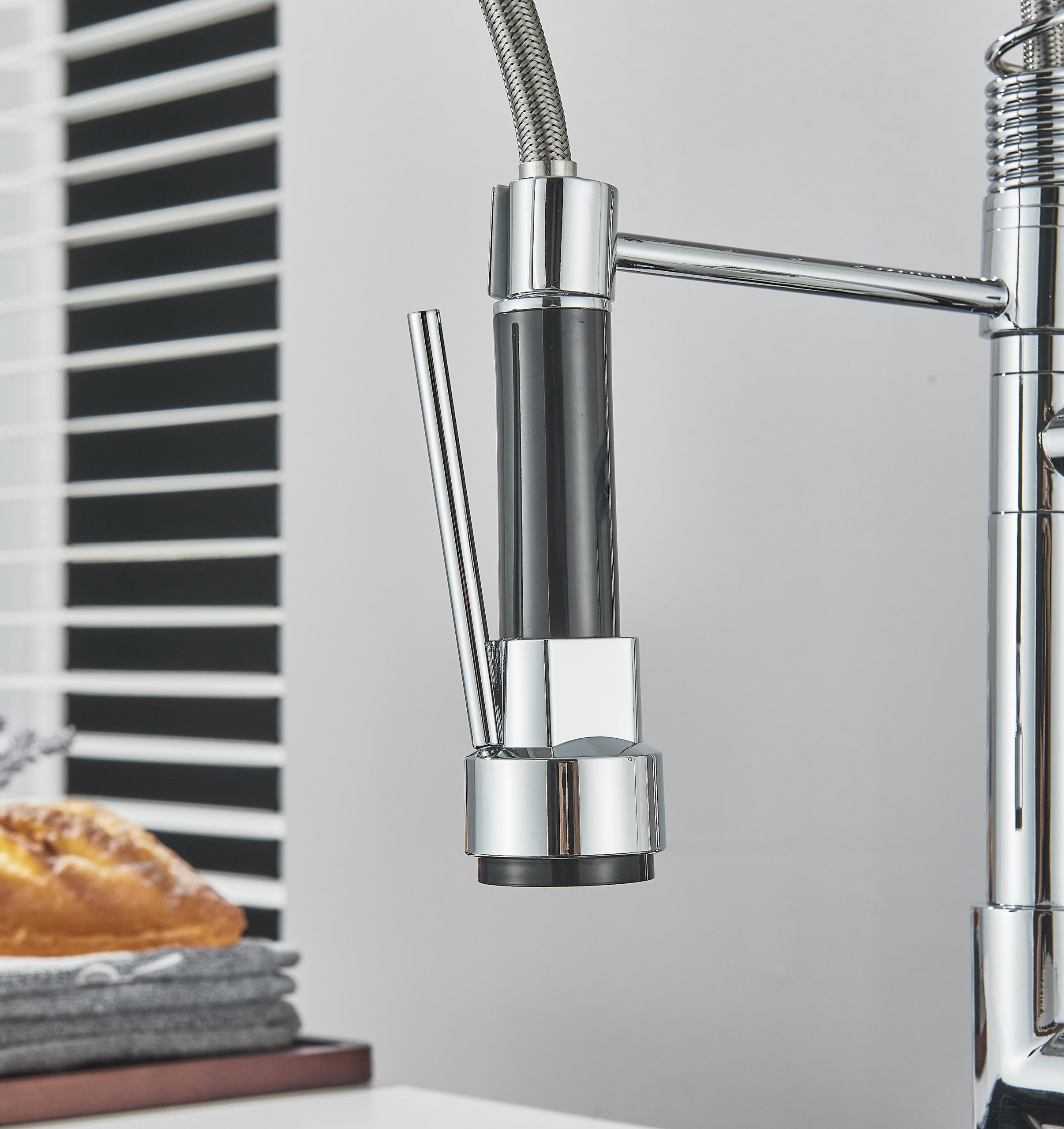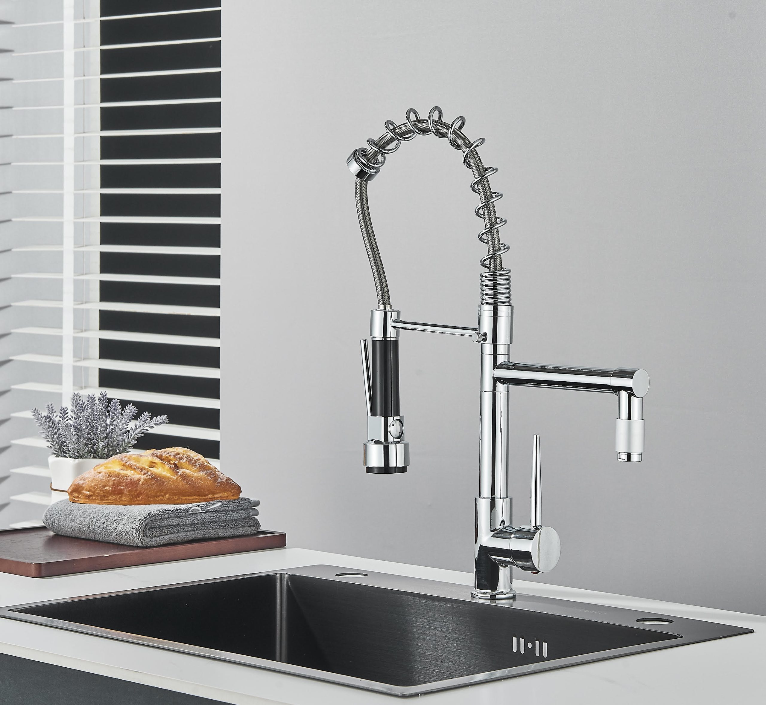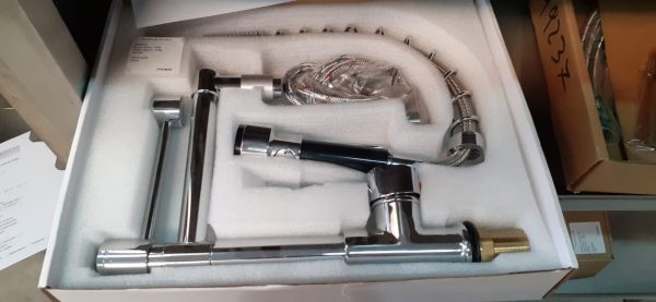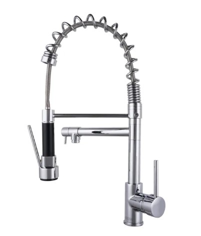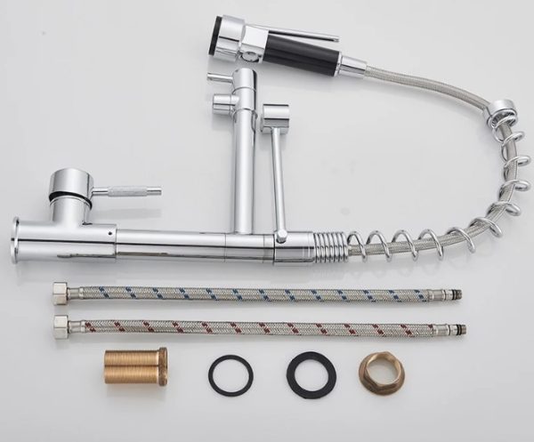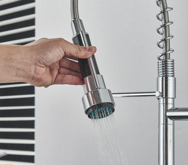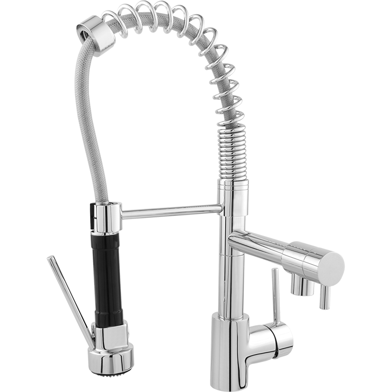 Uso industrial, doméstico e em restaurantes, lares, bares, snack-bar, food-truck. Torneira de guindaste com bico duplo, calor e frio padrão, latão cromado. Concebido com uma forma simples e elegante, torna a sua limpeza diária mais confortável. A nossa torneira tem uma função de rotação de 360°, poupando espaço quando não está a ser utilizada. A torneira da cozinha tem uma função de chuveiro ou spray que pode ser usada simplesmente pressionando a alça para remover a água. O tubo de saída de água conectado ao chuveiro de mão é muito resistente, então você não precisa se preocupar com vazamentos. A sua altura de 49cm faz com que a sua cozinha pareça profissional numa questão de minutos e a um excelente preço.