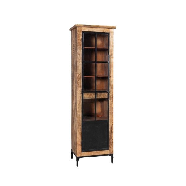 Vitrina Playmouth de abertura à esquerda, vitrina étnica vintage em madeira maciça, inteiramente feita à mão, as portas e os pés são elementos de aço. Esta vitrina em particular tem 5 prateleiras interiores (três superiores mais pequenas e duas inferiores maiores) e 1 porta com vidro. – Dimensões: 65x42x216cm