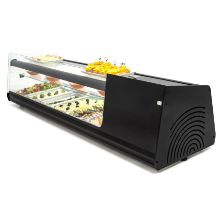 Dados técnicos: – Tipo de exposição: 6 GN1/3-40 (tabuleiros incluídos). – Temperatura: +2 / +6. – Tensão: 230 – Potência total: 1/6 kW – Dimensões: 1456x390x375 mm – Peso: 36 kg